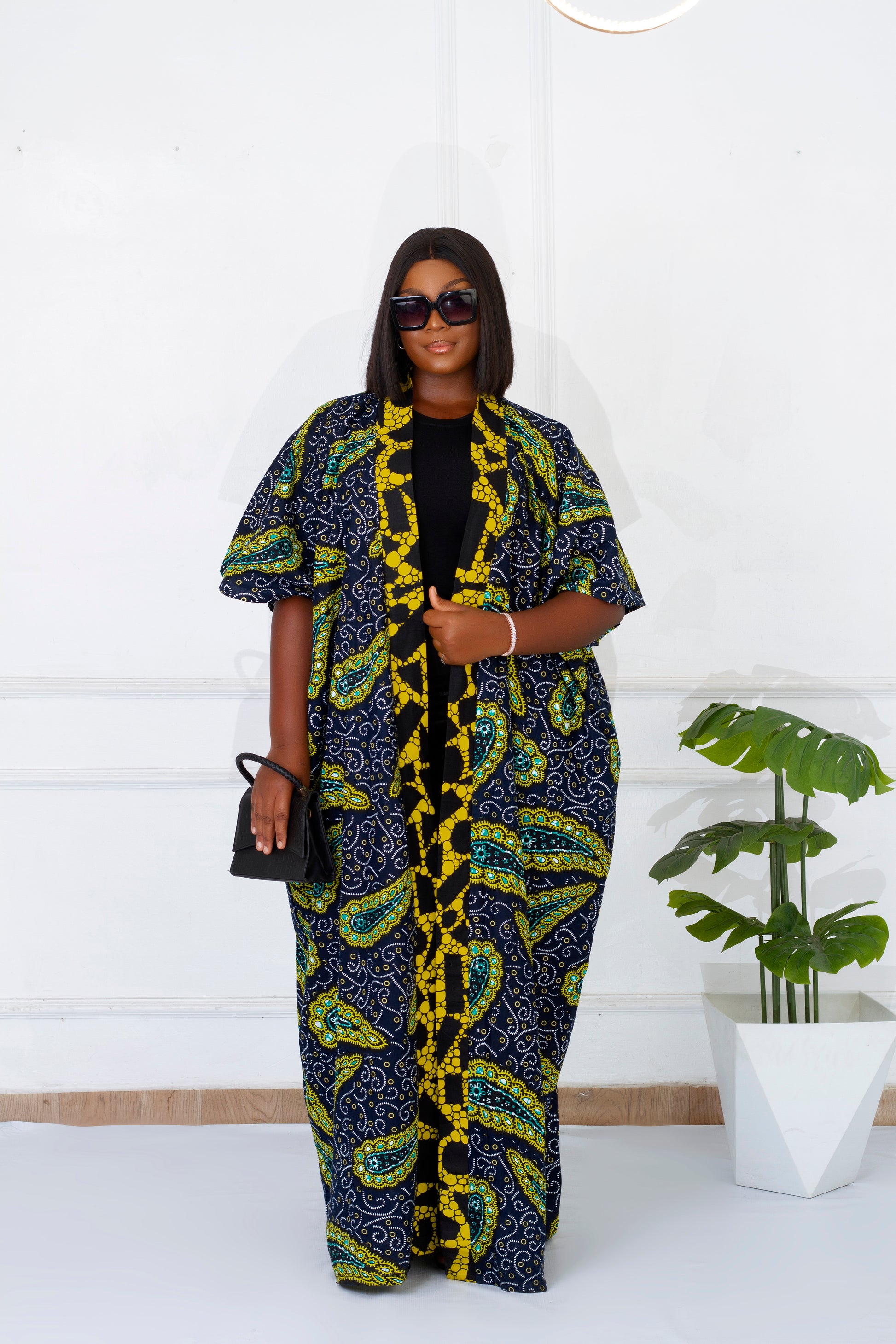 Made with 100% ANKARA COTTON FABRIC In this elegant kimono, you become a living embodiment of grace and refinement. The garment envelops you in an aura of timeless beauty, capturing the essence of traditional Japanese elegance while exuding a captivating presence that commands admiration.