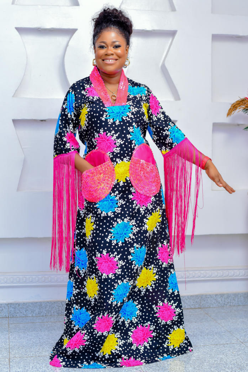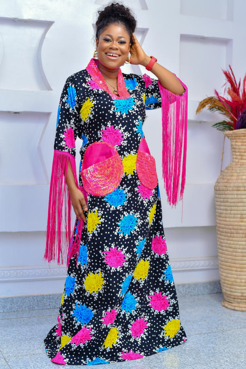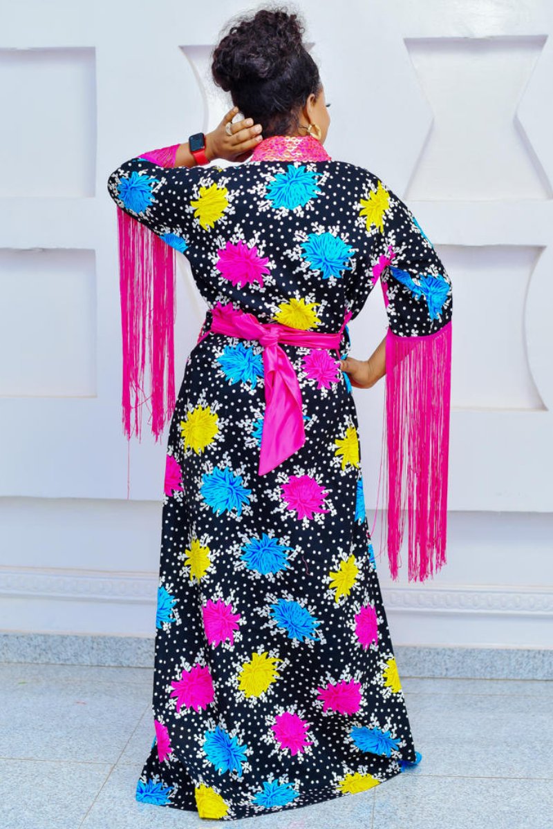 This kaftan is fully beaded at the neck and pocket with long fringe details at the sleeves hence making it a masterpiece of elegance and style, capturing the essence of timeless beauty. Made specially to fit in as each occasion demands.